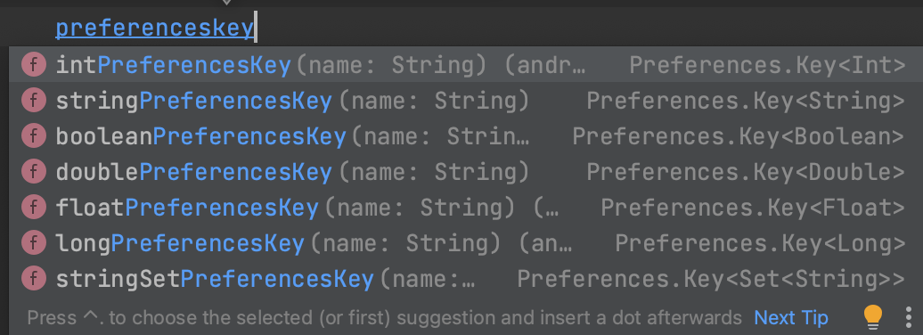 첫째 줄의 intPreferenceKey는 Preference.Key<Int> 를 리턴하는 PreferenceKey이다. 이 외에도 다양한 Preferences.Key들이 있는데 그 종류는 [그림1]에서 확인할 수 있다. 이 7가지 종류가 Preference Datastore에서 저장할 수 있는 데이터의 종류이다.