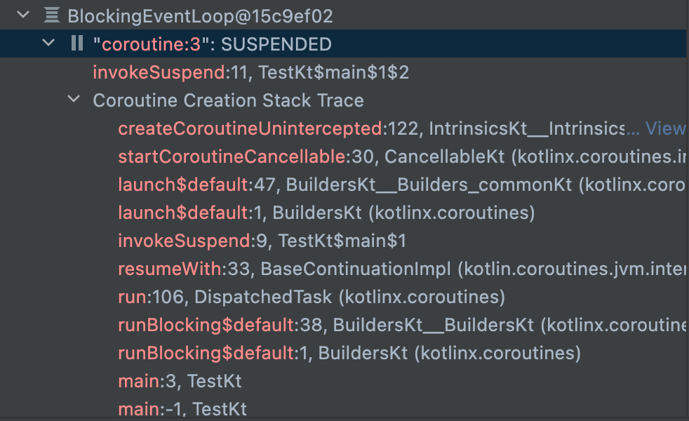 디버깅에서는 Coroutine 현재 상태(RUNNING, SUSPENDED)는 물론 생성 스택, 로컬 변수와 캡처된 변수들까지 확인이 가능하다. 예를 들어 위의 coroutine:3을 펼쳐보면 다음과 같은 정보가 나온다.