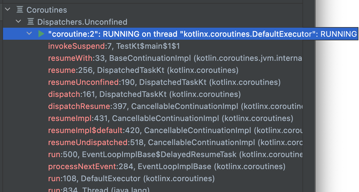 아래 정보를 보면 Dispatchers.Unconfined에서 coroutine:2가 실행중이며, coroutine:2 는 DefaultExecutor 에서 실행 되는 것을 확인할 수 있다.