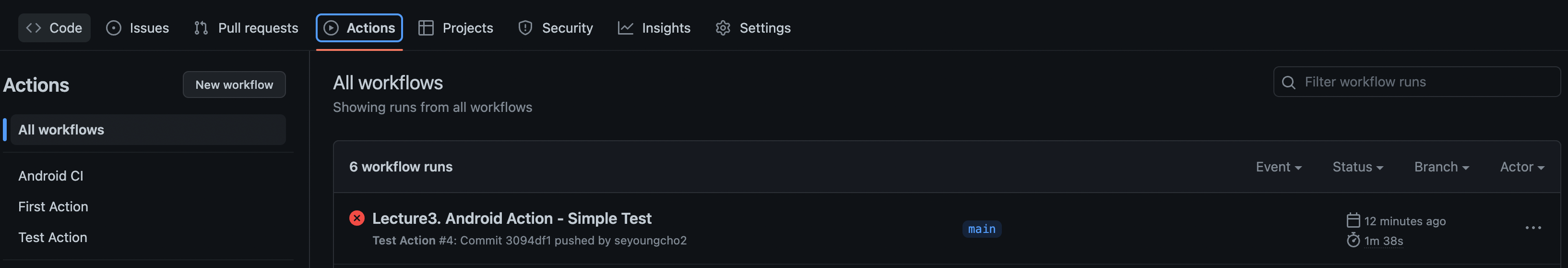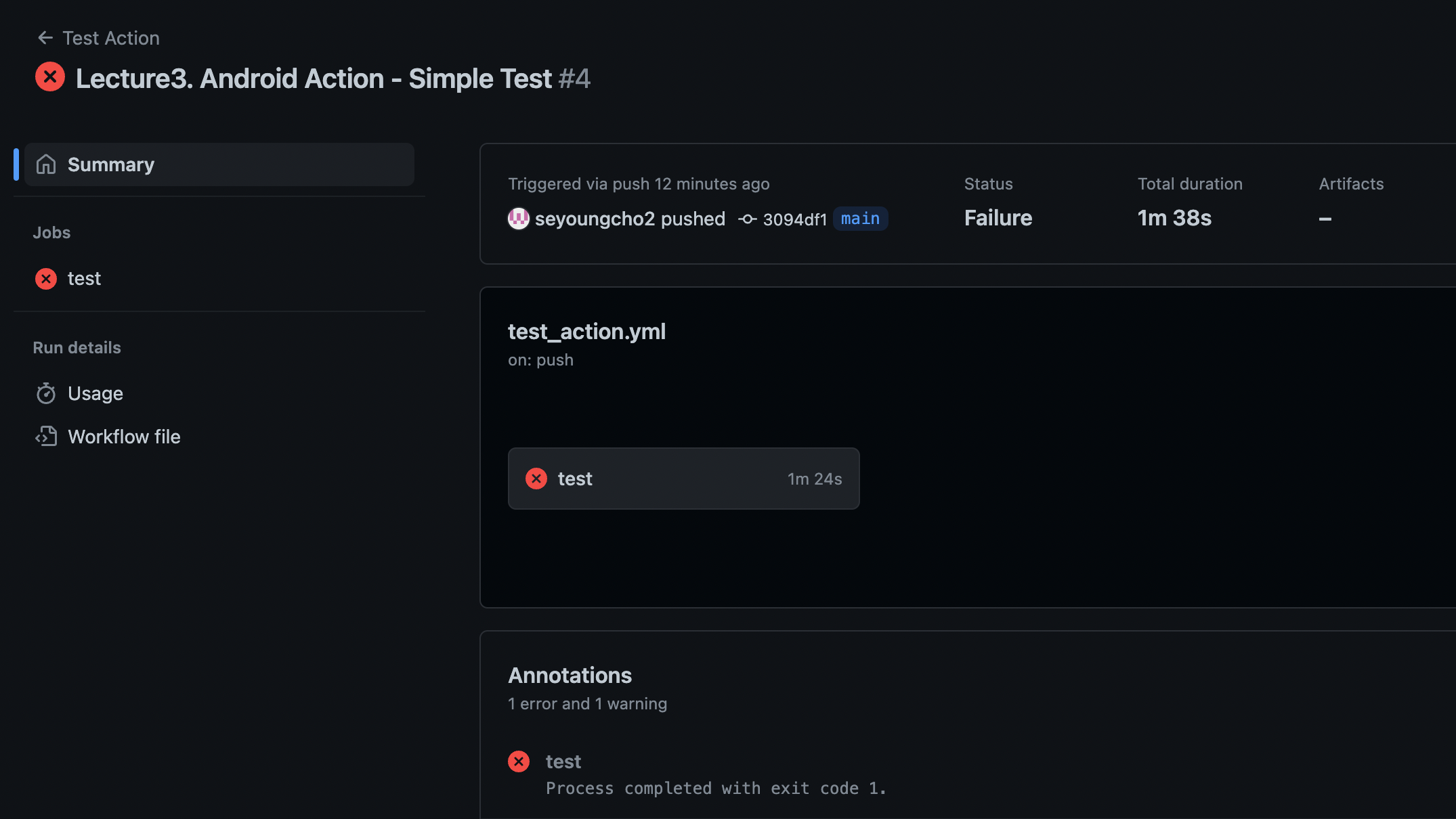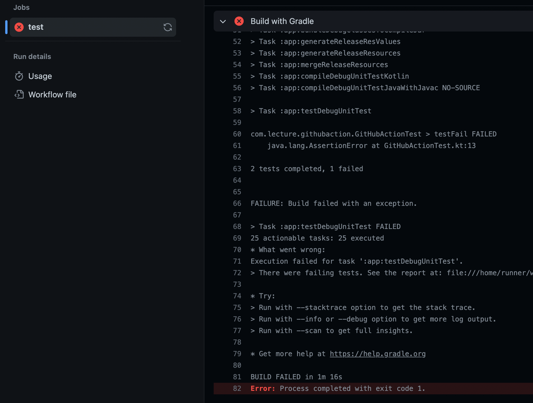 내부를 보면 아래와 같이 Action 이 실패한 것을 확인할 수 있다.