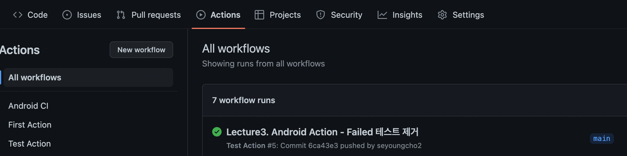 푸시가 일어나면 다음과 같이 Workflow가 자동 실행된 것을 확인할 수 있다.