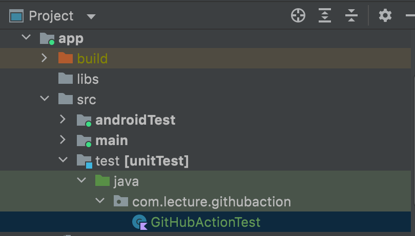 GitHub Action에서 테스트를 돌리기 위해 app/src/test/java/com/lecture/githubaction 경로에 GitHubActionTest.kt 파일을 만든다.