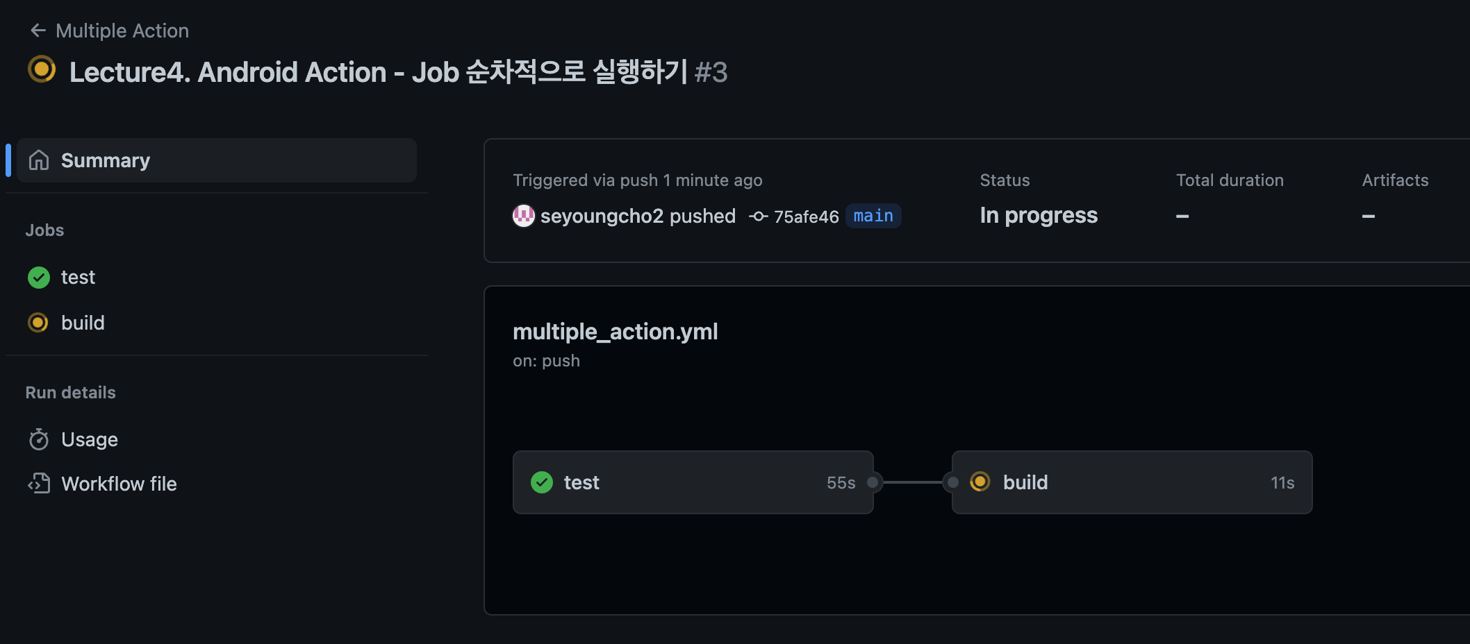 이제 GitHub에서 Actions탭에 들어가면 다음과 같이 Job이 실행되는 것을 확인할 수 있다. test와 build가 병렬로 실행된다. 이유는 Job은 기본적으로 병렬로 실행되기 때문이다.