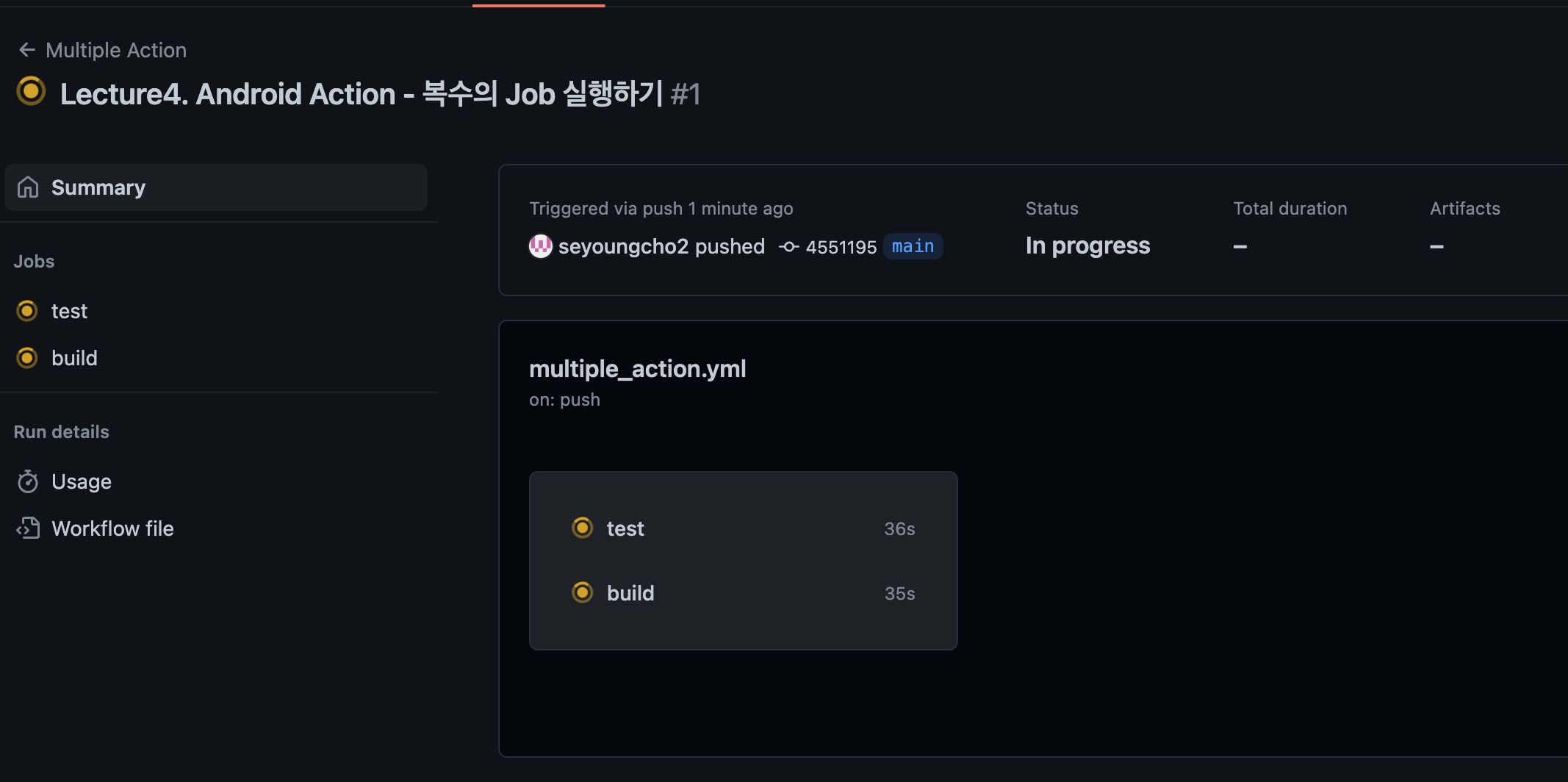 이제 GitHub에서 Actions탭에 들어가면 다음과 같이 Job이 실행되는 것을 확인할 수 있다. test와 build가 병렬로 실행된다. 이유는 Job은 기본적으로 병렬로 실행되기 때문이다.
