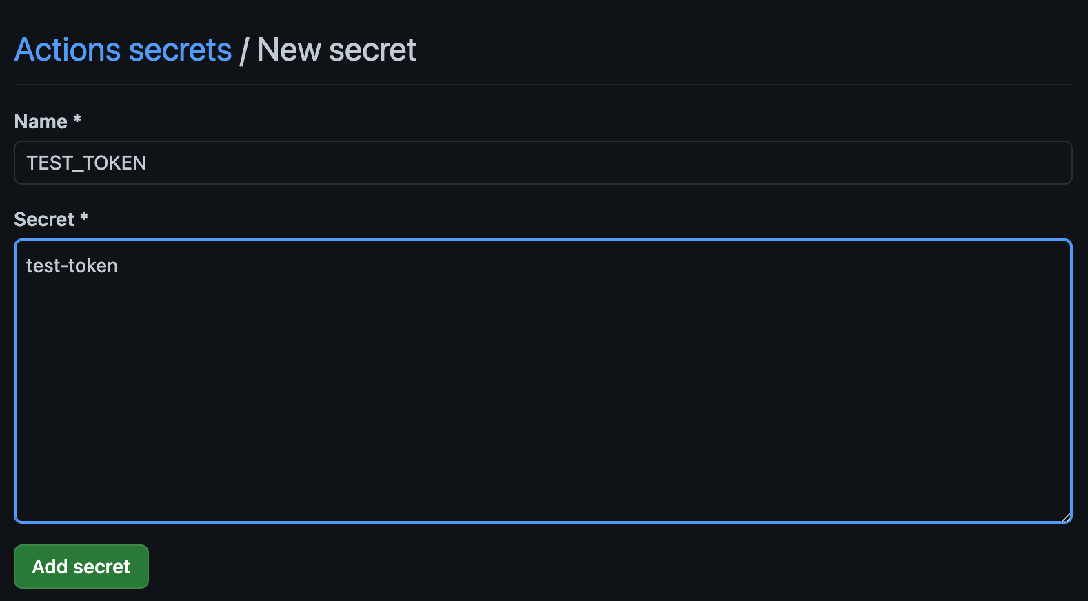 3. Name에 Key 값을 Secret에 Value 값을 입력한다. 여기서는 Key로 TEST_TOKEN 을 사용하고 이에 매핑되는 Secret을 test-token으로 설정했다.