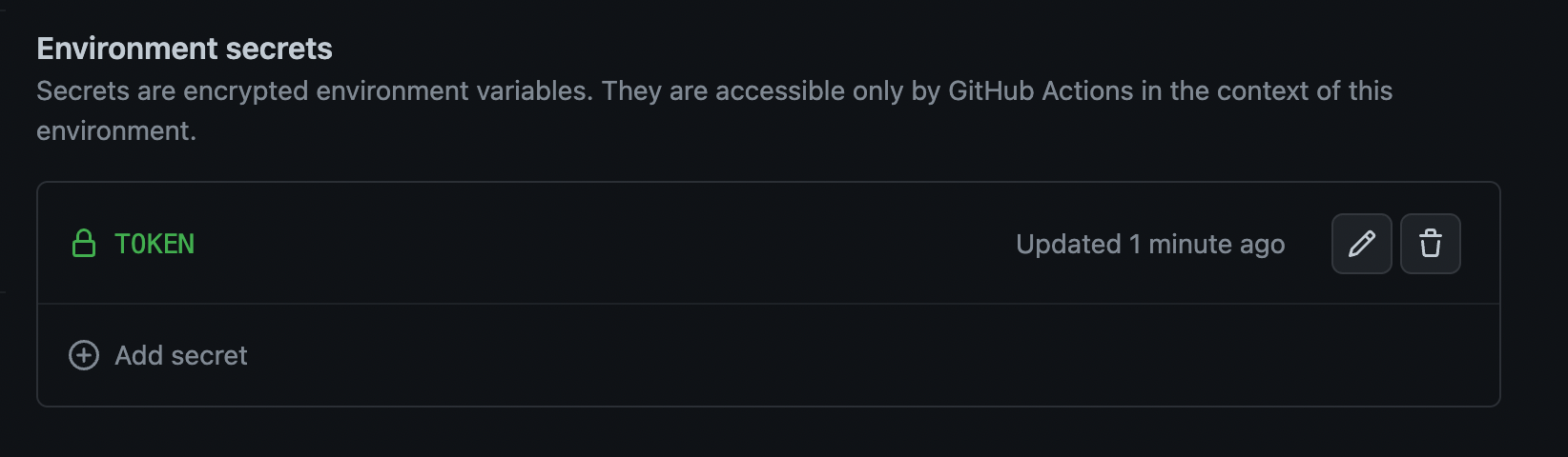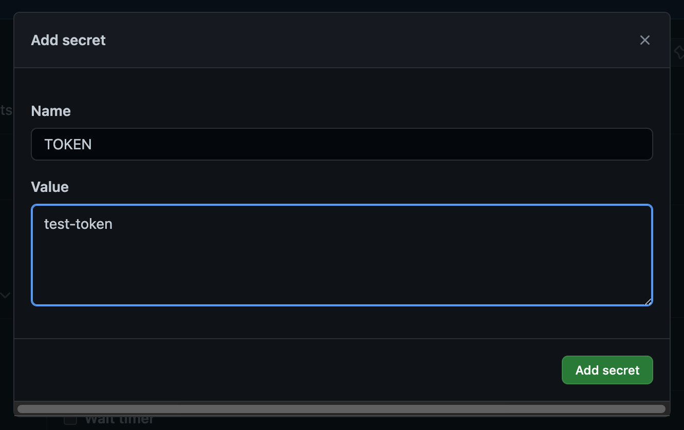 그러면 아래와 같은 화면이 나온다. 우리는 이에 대해 TOKEN을 설정할 것이다. 방금 생성한 environment는 test 환경이기 때문에 test-token을 값에 입력하고 Add secret 버튼을 누른다.