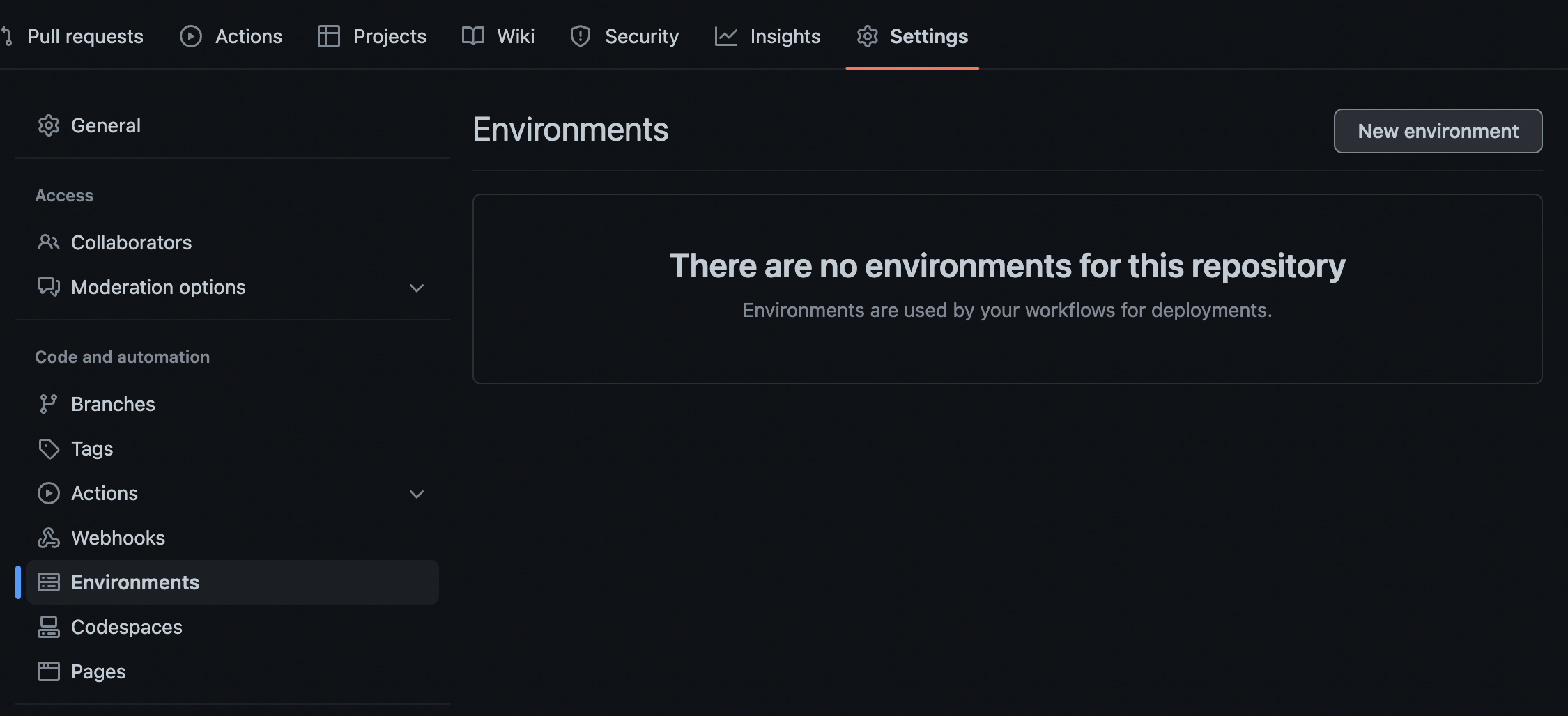환경 별로 다른 Secrets를 생성하기 위해서는 GitHub의 Environment 기능을 설정해야 한다. Environment는 Settings-Environments 에 위치한다.