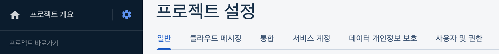만약 여기서 디버그 서명 인증서를 등록하지 못했다면, 프로젝트 개요 옆에 있는 톱니 바퀴 -> 일반 탭을 클릭한다.