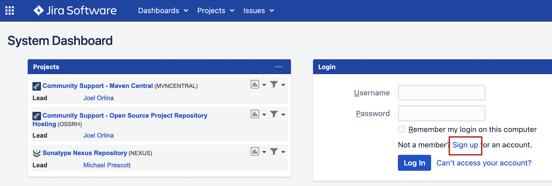 1. Sonatype Jira 주소인 https://issues.sonatype.org/secure/Dashboard.jspa 에 들어가서 Sign up 버튼을 누른다.