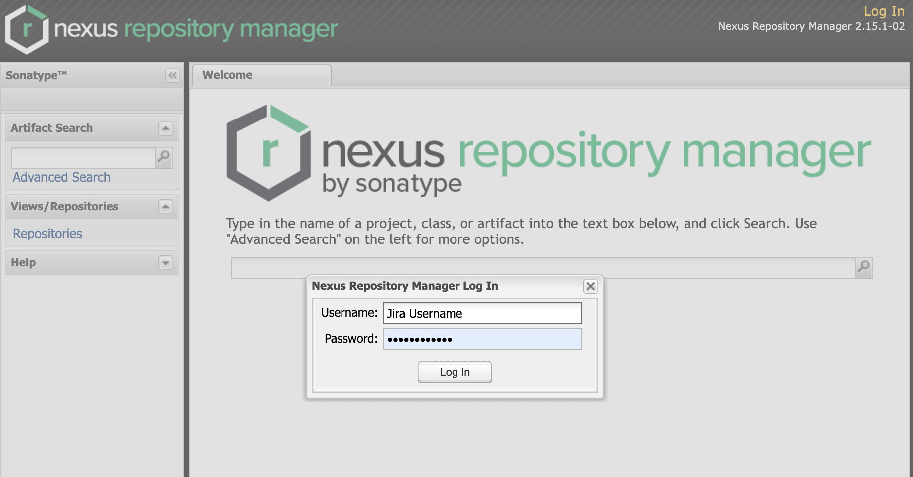 1. 위의 Nexus 주소로 들어가 Log In을 누르면 아래와 같은 화면이 뜬다. 여기에 Jira Username과 비밀번호를 치면 로그인이 된다.