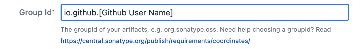 5. Group Id는 io.github.[Github User Name] 으로 만든다. 이후 이에 대한 검증이 들어가기 때문에 꼭 제대로 만들어야 한다.