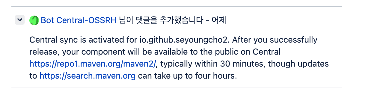 3. 만든 후 댓글을 달면 봇이 Central Repository에 공간이 만들어졌다는 댓글을 단다.
