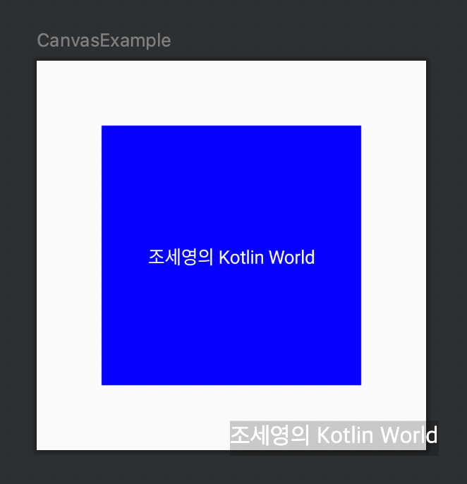 이를 응용해 아래와 같은 Composable을 만들어보도록 하자. Box를 만든 후 내부에 Canvas를 사용해 네모를 그리고 "조세영의 KotlinWorld"라는 글자를 넣는다.