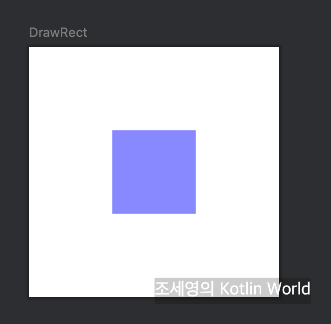 Canvas의 크기가 300dp이므로, 중앙 지점은 150dp이다. 이에 100dp 크기의 정사각형이므로 정사각형의 왼쪽 상단 시작점은 (150-50)dp로 잡아야 한다. 따라서, 좌표계의 x, y좌표를 모두 100.dp.toPx()로 잡아서 사각형의 시작 지점을 만든다음, 사각형의 크기를 100dp로 잡으면 캔버스 정중앙에 100dp 크기의 파란색 정사각형을 그릴 수 있다.