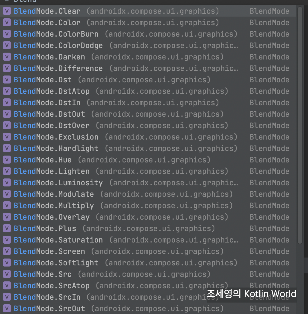 안드로이드는 기본적으로 다양한 BlendMode를 지원하며, 해당 BlendMode에 대해 이 글에서 일일히 다루기는 어렵다.
