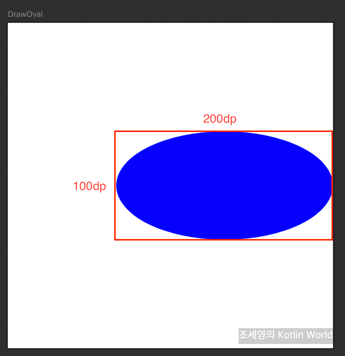 drawCircle은 기준점을 중심점으로 잡았는데, drawOval은 다시 사각형처럼 왼쪽 위를 기준으로 타원을 그린다는 점을 기억하자. 또한 가로, 세로 길이만큼의 직사각형을 만든 후, 직사각형의 크기만큼을 꽉 채우는 타원을 만든다.