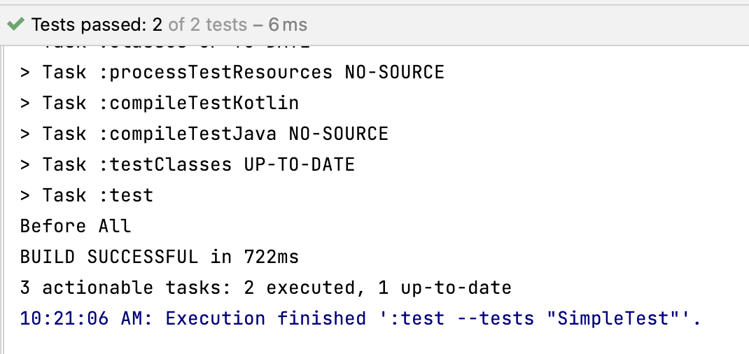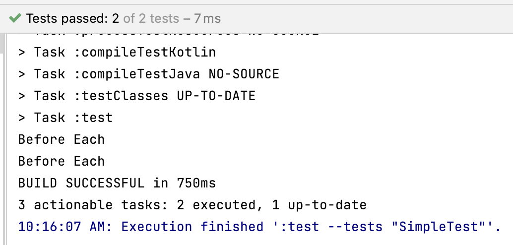 SimpleTest 테스트는 @BeforeEach가 붙은 setUp 함수에서 Before Each를 출력하며, 두 개의 테스트를 가진다. 이 테스트를 실행해보면 다음과 같은 결과가 나오는 것을 볼 수 있다.