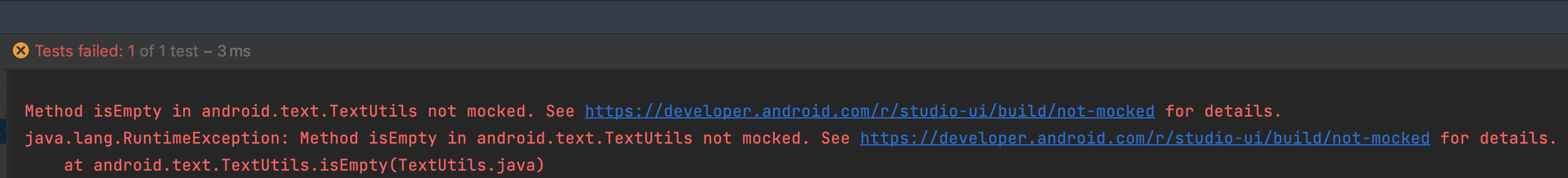이 테스트는 매우 간단한 테스트로, TextUtils.isEmpty를 호출해 매개 변수로 입력된 문자열이 빈칸인지 확인하기 위한 테스트이다. 하지만 이 테스트를 실행하면 다음과 같은 애러가 난다.
