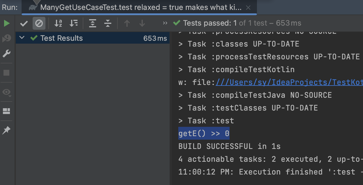 예를 들어 위의 ManyGetUseCase를 테스트하기 위해서는 ManyGetRepository에 대한 응답값을 설정해야 하는데, 이 때 getD와 getE는 사용되지 않기 때문에 응답값을 별도로 설정할 필요가 없다. 이런 경우 다음과 같이 relaxed = true로 설정하고, 관심있는 메서드에 대해서만 반환값을 설정할 수 있다.