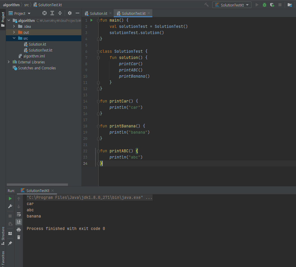 2. Run SolutionKt를 수행하면 다음과 같이 console에 출력됩니다.