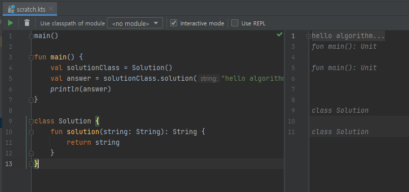 val answer = solutionClass.solution("hello algorithm")