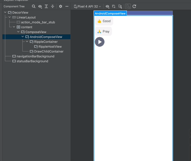 개발 테스트 도중 Android Studio Layout Inspector에서 Compose View들이 보이지 않고 아래와 같이, AndroidComposeView로만 뭉뚱그려 나오는 문제가 발생했다.