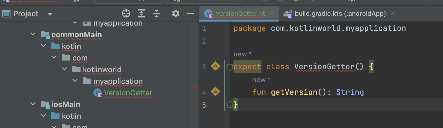 예를 들어 다음과 같은 commonMain 모듈에 다음과 같이 VersionGetter 클래스를 expect class로 만들어보자.