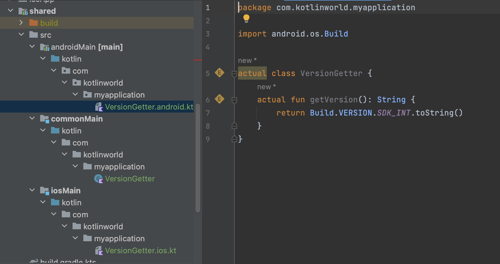 이 문제를 해결하기 위해서는 shared 모듈의 androidMain과 iosMain에 각각 actual class로 VersionGetter을 구현해야 한다.