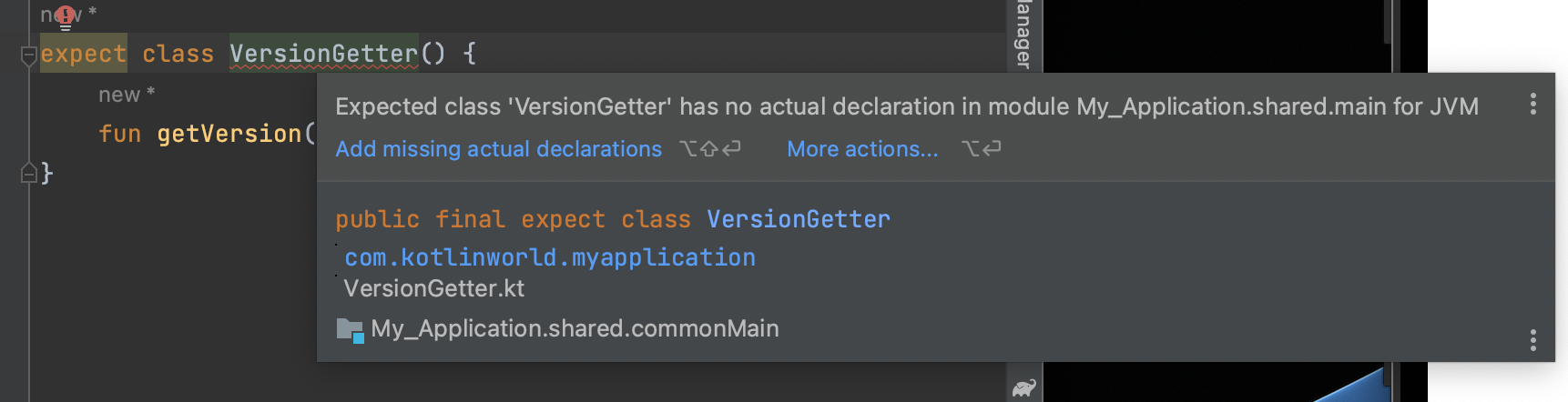 그러면 이 VersionGetter 클래스는 오류를 낸다. 이유는 VersionGetter 클래스의 선언이 androidMain과 iosMain 모듈에서 구현되지 않았기 때문이다.