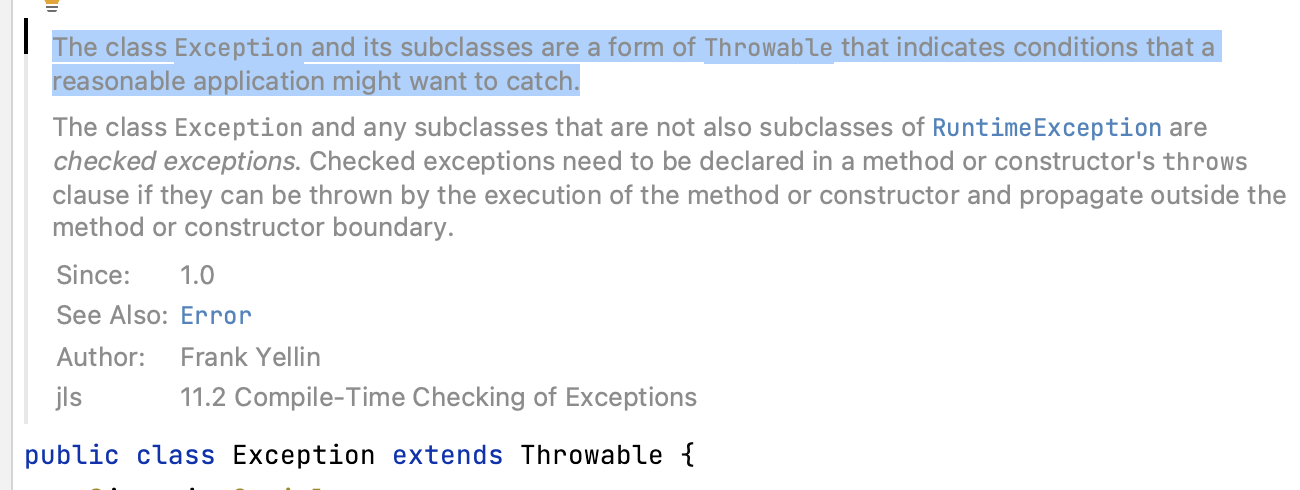 실제로 Exception 클래스의 주석 설명에는 다음과 같이 표시되어 있다.