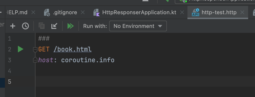 .http 파일을 만들었으면, 이번에는 HTTP Request를 작성할 차례다. HTTP Request의 형식에 맞춰 Request를 작성한다. 예를 들어 coroutine.info 링크의 book path의 리소스를 보고 싶으면 https://coroutine.info/book.html 링크의 리소스를 GET 메서드를 통해 가져와야 한다. 이는 다음과 같이 작성될 수 있다.