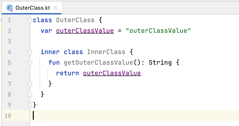 자바에서는 내부에 선언되는 중첩 클래스에서 기본적으로 바깥쪽 클래스의 변수를 참조할 수 있었다. 예를 들어 다음과 같이 OuterClass와 InnerClass가 있는 경우 InnerClass의 함수인 getOuterClassValue에서 OuterClass의 변수인 outerClassValue를 참조할 수 있었다.