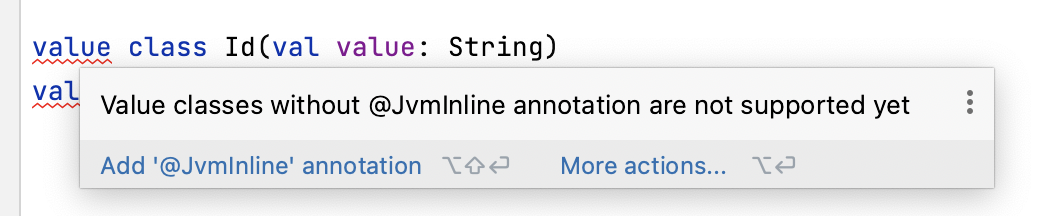 번역: @JvmInline 어노테이션이 붙지 않은 value class는 아직 지원되지 않습니다.