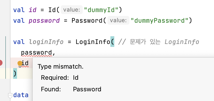 하지만, 이렇게 아이디나 비밀번호를 String 타입 값으로 설정하는 것은 안전하지 않다. String은 이곳저곳에서 다 쓰이는 타입이기 때문에 언제든 실수가 일어날 수 있기 때문이다. 예를 들어 다음과 같이 id 자리에 password를 넣고 password 자리에 id를 넣는 실수를 할 수 있다.