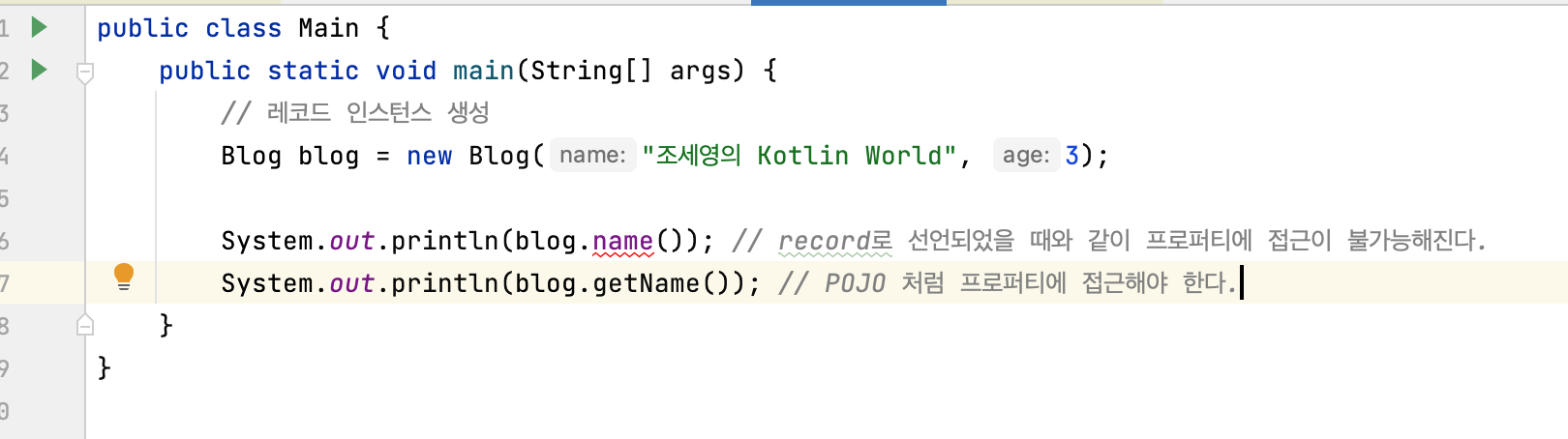 이 Blog 클래스는 이름(name)과 생긴 후 지난 날짜(age)를 인자로 받는다. 이제 이 record 클래스가 어떻게 동작하는지 확인하기 위해 다음과 같이 코드를 만들어보자.