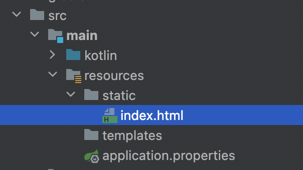 이제 resources/static 폴더에 index.html 파일을 만들어보자. index.html 파일이 작성된 위치는 src/main/resources/static/index.html이다.