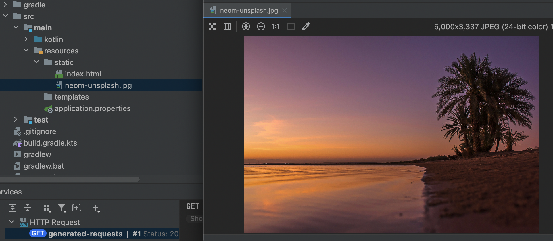 이번에는 스프링 애플리케이션이 이미지 파일을 반환하도록 만들어보자. 이미지 파일을 반환해 보기 위해 unsplash 사이트에서 임의의 파일을 다운로드하여 static 폴더에 넣는다. 이미지 파일의 이름은 neom-unsplash.jpg이다.