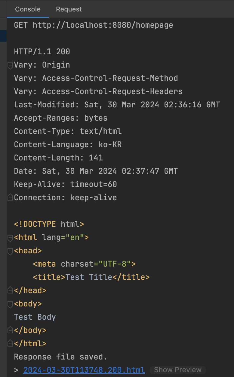 준비가 모두 완료되었으면, 스프링 애플리케이션을 실행하고, /homepage 경로로 요청을 날려보자. 그러면 다음과 같은 결과가 나오는 것을 볼 수 있으며, resources/static/index.html 경로의 파일이 반환된 것을 확인할 수 있으며, Content-Type이 자동으로 text/html로 만들어진 것을 볼 수 있다.