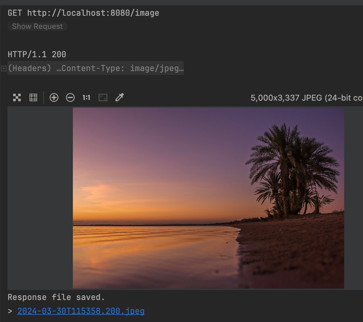 이제 Spring 애플리케이션을 재실행해보고, http://localhost:8080/image 경로로 get 요청을 날려보자. 그러면 다음과 같은 결과가 나오는 것을 볼 수 있다.