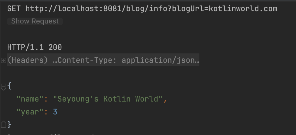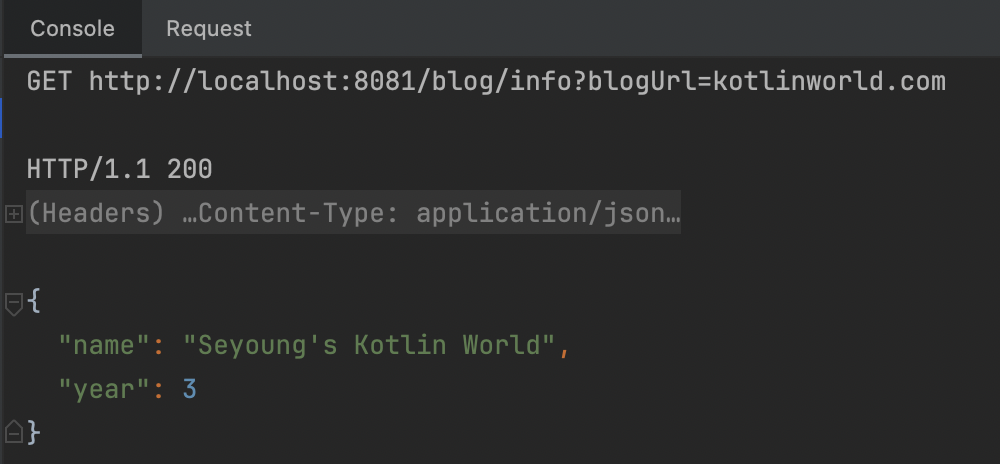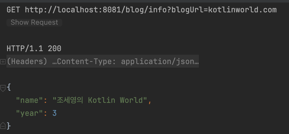이와 같이 스프링 프레임웍은 RequestHeader의 value 값에 해당하는 키를 읽어 변수에 매핑한다. 이제 위와 같이 코드를 작성하고, /blog/info 경로에 다음과 같은 HTTP 요청을 날려보자. 이 Http 요청은 query 로 blogUrl=kotlinworld.com을 포함하며, 헤더에는 Accept-Language: ko를 가진다.