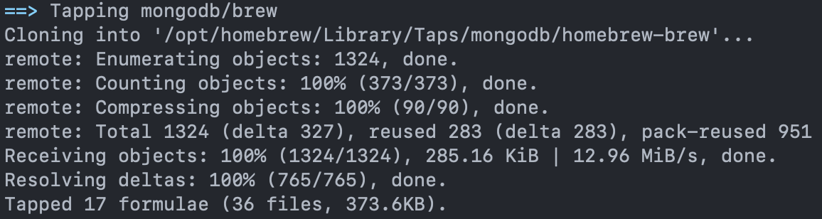 brew tap은 Homebrew 패키지 저장소를 확장하거나, 사용자가 지정하는 저장소를 추가하는데 사용된다. 만약 mongodb/brew 탭을 확장하지 않으면, Homebrew가 mongodb 설치 경로를 찾을 수 없다.