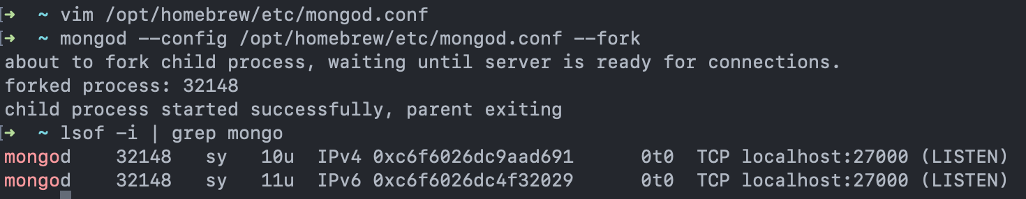 이제 다시 MongoDB를 실행하고 프로세스의 포트를 확인하면 27000번 포트로 실행이 된 것을 확인할 수 있다. 다음은 내 macOS에서 실행한 결과이다. 마지막 줄에서 27000번 포트에서 실행되고 있는 것을 볼 수 있다.