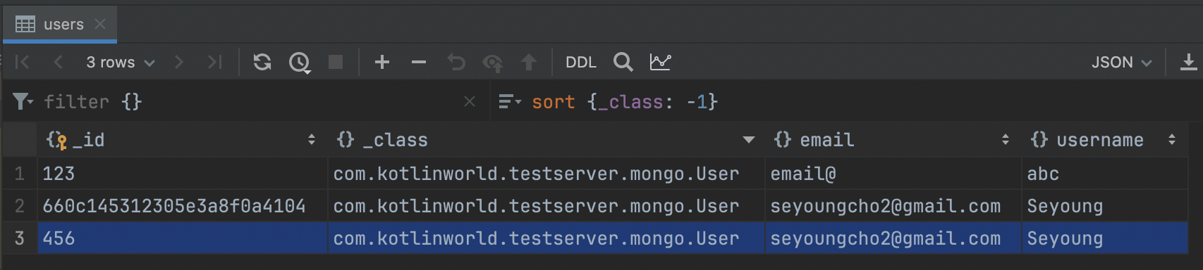 그러면 MongoDB의 Users Document에 입력한 값이 추가된 것을 확인할 수 있다.