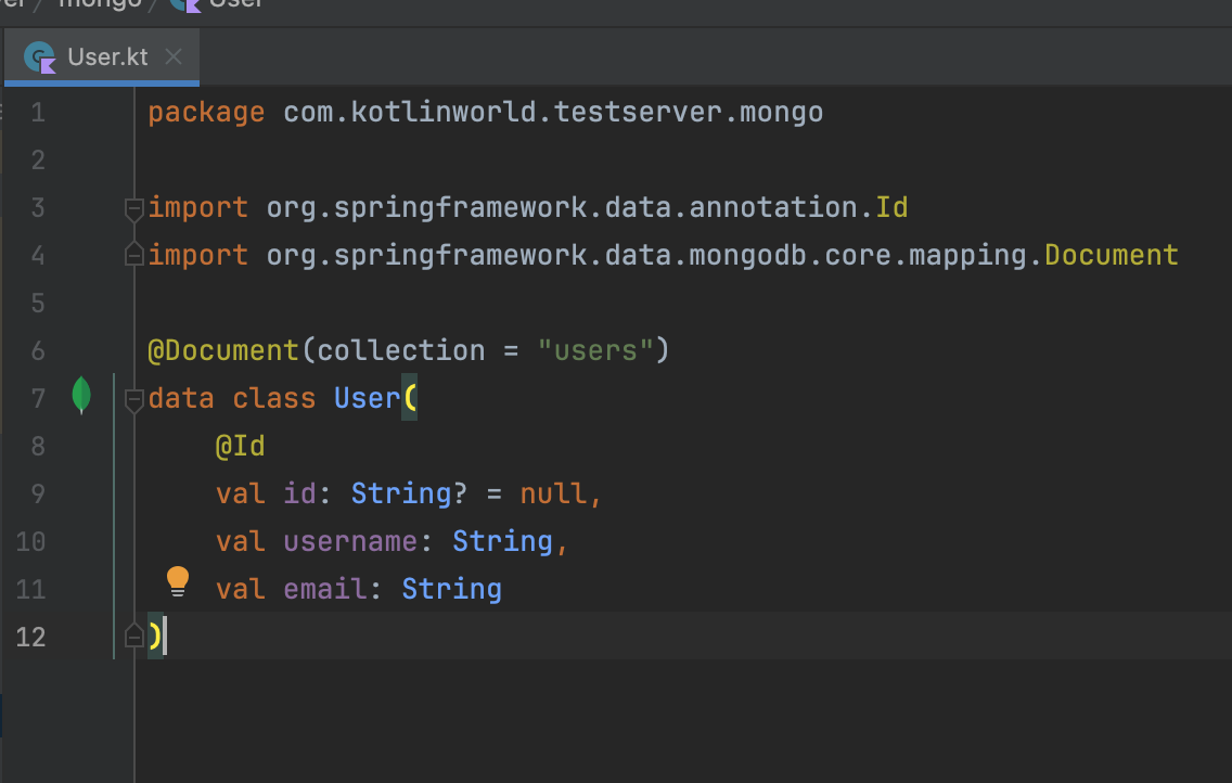 다음은 MongoDB에서 사용할 Document를 만들어야 한다. 이곳에서는 유저의 정보를 저장하는 User 클래스를 Document로 만들었다. 이 클래스는 이제 MongoDB의 users 컬렉션에 저장될 것이다.
