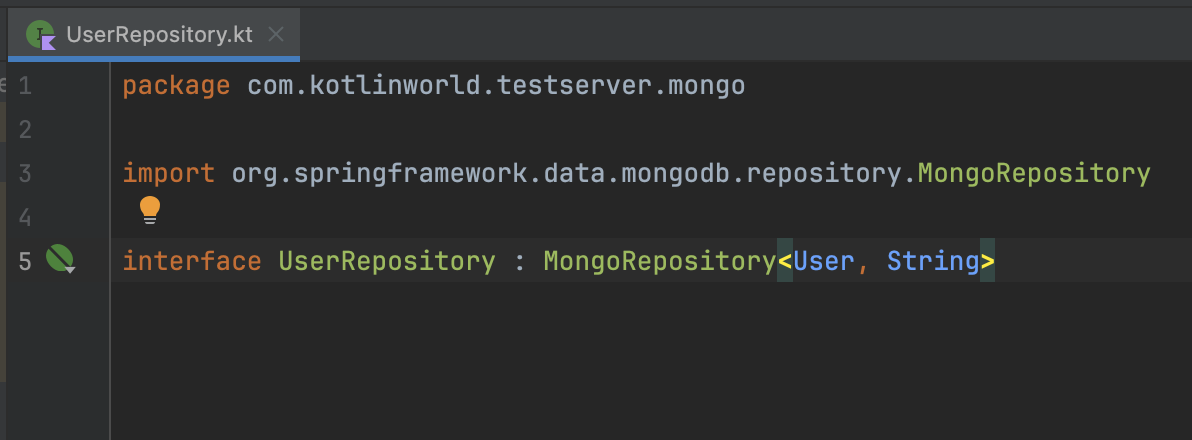 다음에는 Document에 대한 CRUD연산을 실행하는 Repository를 만들어야 한다. 이곳에서는 MongoRepository를 상속 받는 UserRepository를 다음과 같이 만든다.