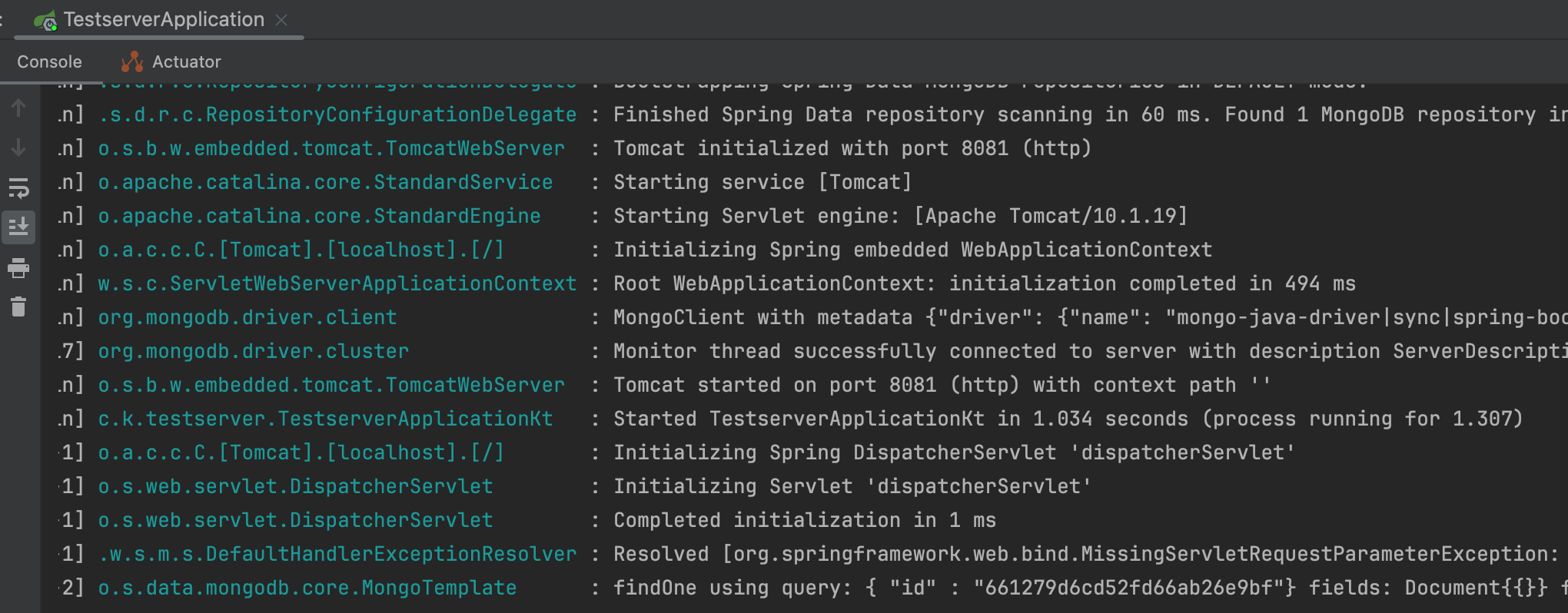 findOne using query: { "id" : "661279d6cd52fd66ab26e9bf"} fields: Document{{}} for class: class com.kotlinworld.testserver.mongo.Book in collection: books