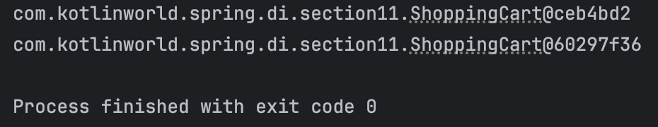 이를 확인하기 위해 다음 코드와 같이 getBean(ShoppingCart::class.java)을 두 번 호출하고 출력을 확인 해보자.