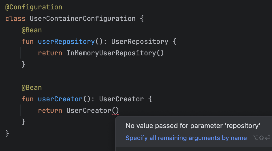 의존성을 주입하는 방법은 간단하다. UserCreator Bean을 만들 때 UserRepository를 userCreator 함수의 인자로 넘기면 된다. 다음 코드에서는 userCreator 함수의 인자로 UserRepository 객체를 넘겼다.