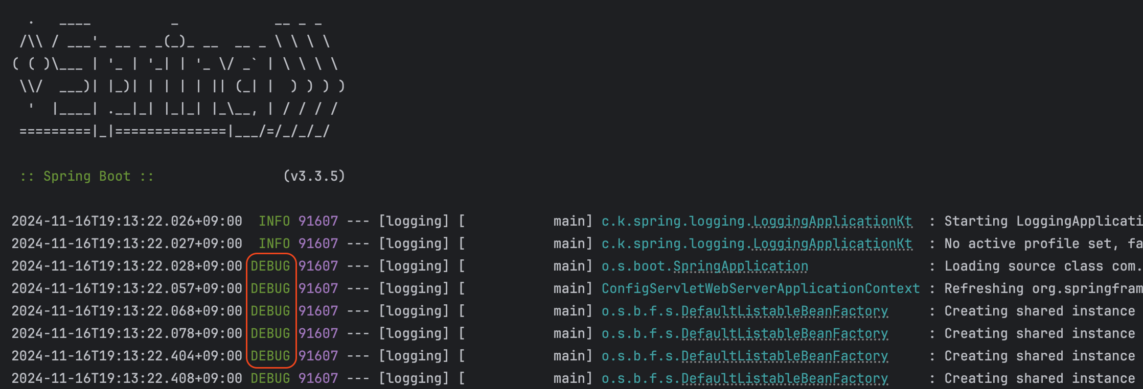 로그 레벨이 제대로 설정됐는지 확인하기 위해 Spring 애플리케이션을 실행해보면 다음과 같이 DEBUG 레벨의 로그가 출력되는 것을 볼 수 있다.