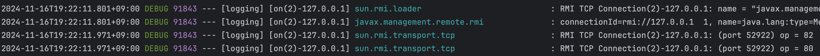 로그 레벨이 제대로 설정됐는지 확인하기 위해 Spring 애플리케이션을 실행해보면 다음과 같이 DEBUG 레벨의 로그가 출력되는 것을 볼 수 있다.